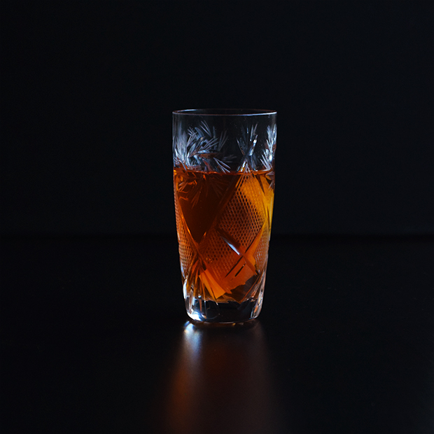 - Strain the cocktail into the drinking glass. I used a vintage julep strainer here, but anything to trap the ice shards will do.